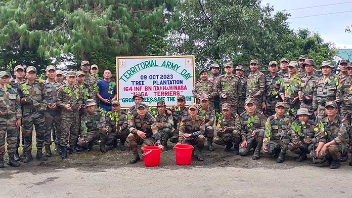 Kohima: Territorial Army Day was observed with a tree plantation drive organised by 164 INF Bn (TA) (H&H) Naga, in collaboration with department of Tourism, at Kisama on Monday. The tree plantation under the theme, “Grow Trees, Save The Earth”, was led by second-in-command, HN Suanlian and executed by the “Naga Terriers”.