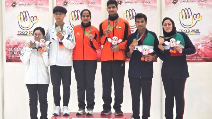 Abhinav Deshwal and Pranjali Prashant Dhumal clinched the gold medal in the 10m Air Pistol event, while Kushagra Singh Rajawat won bronze in the 50m Rifle Prone competition as Indian shooters continued their fine run at the 25th Deaflympics here on Wednesday.