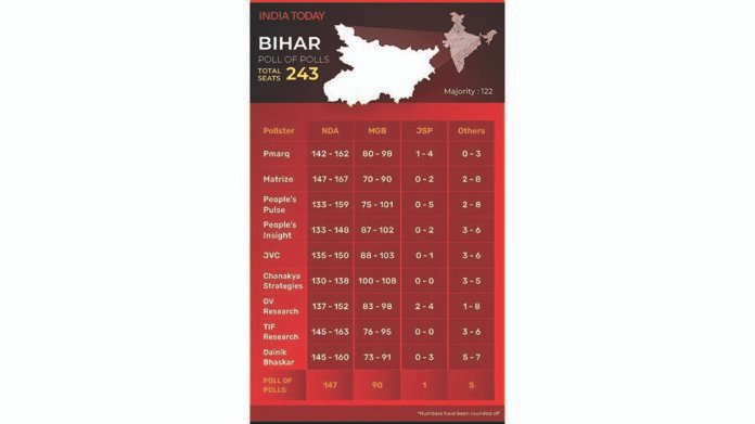 As voting in the Bihar assembly election 2025 came to a close on Tuesday evening, major exit poll agencies predicted a big win for the National Democratic Alliance (NDA). According to Bihar election exit poll results released by Matrize and People’s Pulse, the JDU-led NDA is expected to form the government once again with a clear majority.