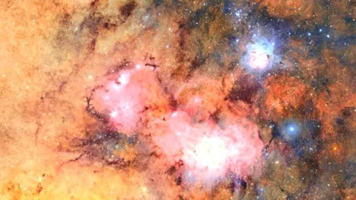 In one picture, vast colourful gas and dust clouds swirl in a star-forming region 9,000 light years from Earth.
