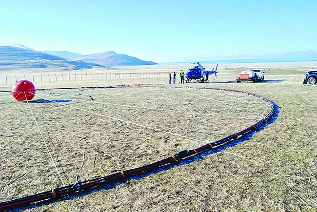 This latest paper measured electrical resistivity to a depth of about 100 meters via airborne electromagnetic surveys to discern freshwater from brine, which is far more electrically conductive. To see if this could be done, Johnson and Zhdanov hired a geophysical crew from Canada to fly electromagnetic equipment dangled under a helicopter in February 2025. The helicopter flew 10 east-west survey lines spanning Farmington Bay and across the northern portion of Antelope Island, for a total of 154 miles.