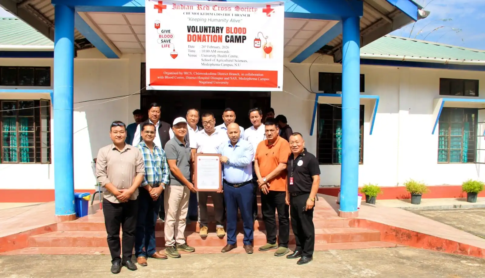 The Indian Red Cross Society (IRCS) Chumoukedima district branch, in collaboration with NU Health Centre SAS Medziphema and the Blood Centre Team of District Hospital Dimapur, conducted a voluntary blood donation camp at Nagaland University, Medziphema Campus on February 20, 2026.