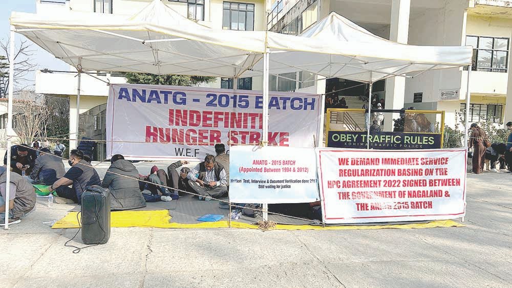 The All Nagaland Ad-hoc Teachers’ Group (ANATG), 2015 batch, on Wednesday launched an indefinite hunger strike on the seventh day of its agitation, citing the absence of an official response from the state government on its demand for service regularisation.