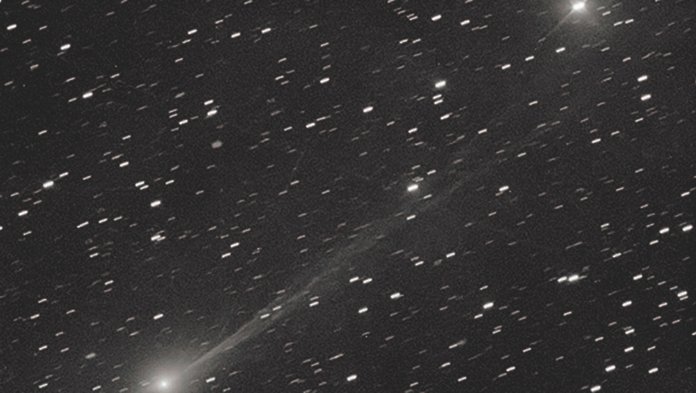 The comet is visible from Earth in the predawn sky by using binoculars or a telescope.