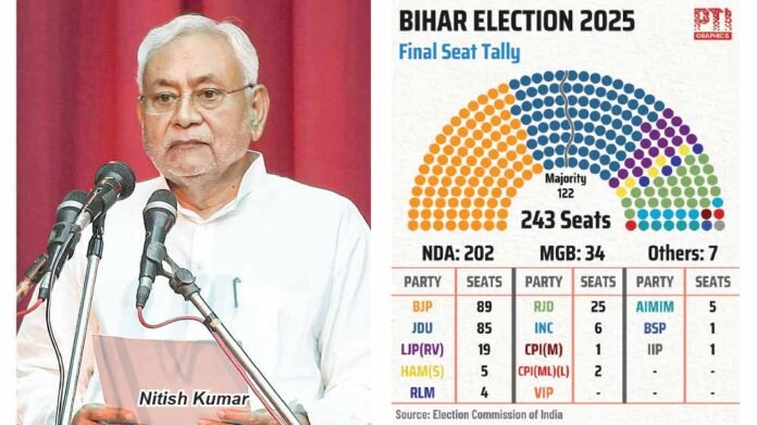 While BJP won 89 seats, up from 74 in 2020, Nitish Kumar’s Janata Dal(U) tasted success in 85 constituencies, up from 43. The majority mark in the 243-member Assembly is 122. Rashtriya Janata Dal (RJD) seat tally slipped to 25 from 75, and Congress bagged only six out of the 61 seats it contested, down from 19. Overcoming anti-incumbency, Chief Minister Kumar thanked the people of the state for giving a “landslide” victory for the NDA. He also expressed gratitude to PM Modi for his continuous support to NDA government in the state.