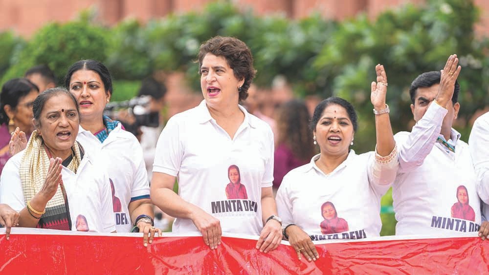 Several MPs, including Priyanka Gandhi, were seen wearing white T-shirts with ‘Minta Devi’ and her photo emblazoned on it and ‘124 Not Out’ written at the back.