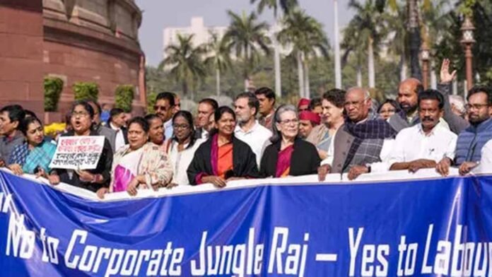 Slamming the Centre, Kharge accused the Modi government of being “anti-labour, anti-worker and pro-cronies”. In a post on X after the protest by the opposition, Kharge said the Opposition parties protested against the Modi government in Parliament premises, expressing strong objection about the newly implemented labour codes.
