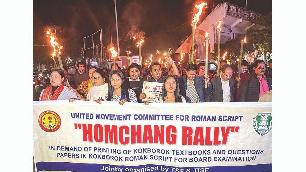 Although such situations were resolved through government intervention, the broader debate over script selection has continued. Following the Chief Minister’s remarks, the Tipra Motha Party strongly criticised his statement, after which student organisations announced the torch rallies.