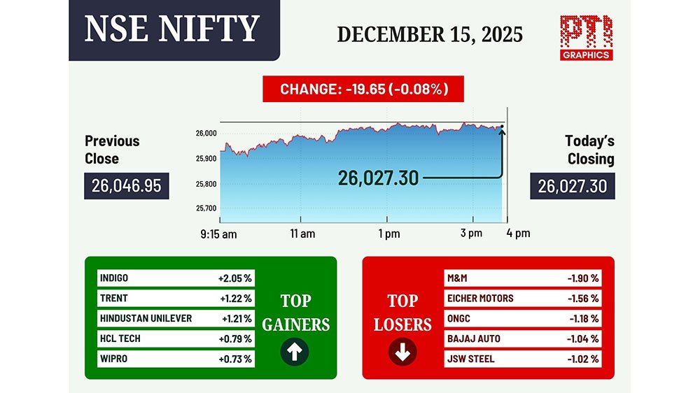 During the day, the benchmark declined 427.34 points, or 0.50 per cent, to 84,840.32. The 50-share NSE Nifty edged lower by 19.65 points, or 0.08 per cent, to 26,027.30. From the Sensex firms, Mahindra & Mahindra, Maruti, Adani Ports, Bajaj Finserv, Titan, and HDFC Bank were among the major laggards.