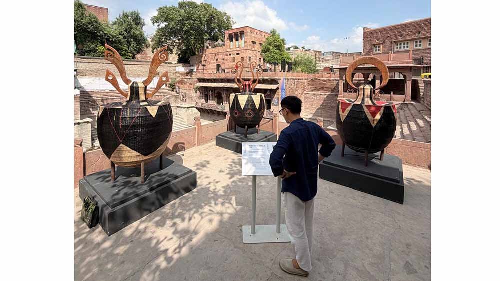 In a press release by Heirloom Naga Centre, Urra Design / Cane Concept, Imtisenla Changkiri stated that the installation featured three monumental handwoven vessels inspired by the traditional Rajasthani surahi, and handcrafted entirely on-site in collaboration with Jodhpur’s master artisans, the work was a layered exchange between the craft traditions of Rajasthan and Nagaland, two regions Zeliang is intimately connected with, having been born in Nagaland and raised in Rajasthan.