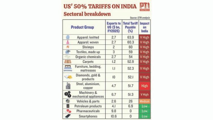 Economic think tank GTRI said the US tariffs will hit 66 per cent of India’s USD 86.5 billion exports to America.