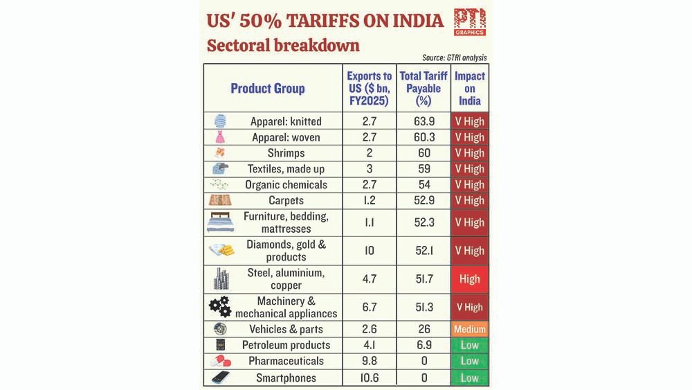 The US’s 50 per cent tariffs on Indian goods came into effect on Wednesday, and it will impact exports and job creation in labour-intensive sectors such as shrimp, apparel, diamonds, leather and footwear, and gems and jewellery.
